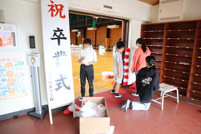 3月22日(水)6年生は今日が修了式でした。いよいよ明日が卒業式だと思うと何となく物悲しい感じがします。そんな雰囲気の中、4・5年生が卒業式の準備をしました。昼食を食べて、午後1時から体育館や6年教室、廊下、駐車場周辺などを掃除するところから始めました。きれいに整理されたところで、式場である体育館の式場設営と最後の授業を行うEルームと6年教室の飾りつけを行いました。立派な式場と教室が出来上がりました。