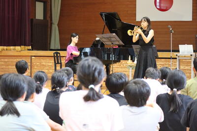 今日は、10月にある文化庁の芸術体験へ向けたワークショップがあり、5・6年生が体験しました。まず、フルートとトランペット、様々なパーカッションの音色を確かめるためにそれぞれで曲を園損していただきました。その後、パーカッションのクイズや指揮の練習、ボディパーカッションの練習などを行いました。10月の本公演が待ち遠しくなりました。