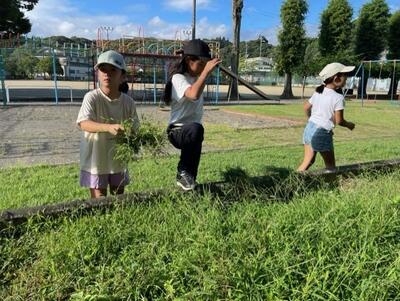 朝から2年生の子どもたちが交代で学年花壇の草取りをしています。2年生は花壇に夏野菜を植えていたのですが、その野菜の時期が終わってしまい、花壇が草だらけになっていました。次の冬野菜を植える準備をするまで草取りを頑張るようです。