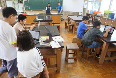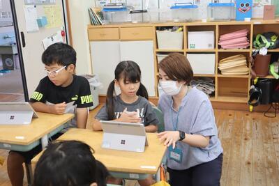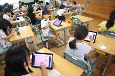 今日は、1・2年生が、2学期が始まって、初めてのタブレットを使う学習をしました。ログインする方法を忘れている可能性があったため、ICT支援員の先生や学習サポーターの方々にご協力をいただき、学習を進めました。子どもたちはすぐにやり方を思い出し、手慣れた感じでタブレットを使っていました。