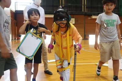 4年生は総合的な学習の時間に「福祉」について学んでいます。その一環で、社会福祉協議会の方に来ていただき、「認知症サポーター養成講座」を行いました。認知症や認知症の方へのサポートの仕方について学んだあと、実際の高齢者や認知症の方の様子を疑似体験し、大変さを感じていました。とても貴重な体験ができたようでした。