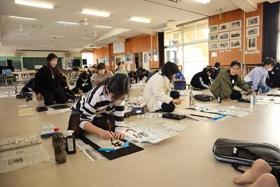 人吉市の書写展へ向けてそれぞれの学年で書初めに取り組んでいます。高学年では小型条幅紙に書くため、普段の机ではなく、床で書初めに取り組んでいました。広い場所が必要となるため、5年生は、Eルームいっぱいを使って書いていました。