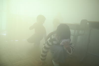 煙体験では煙(無害な薬品を使って発生させた煙)を教室に充満させた中で出口まで逃げる体験をしました。体制を低くしていないと前が見えないという体験はとても貴重な体験でした。
