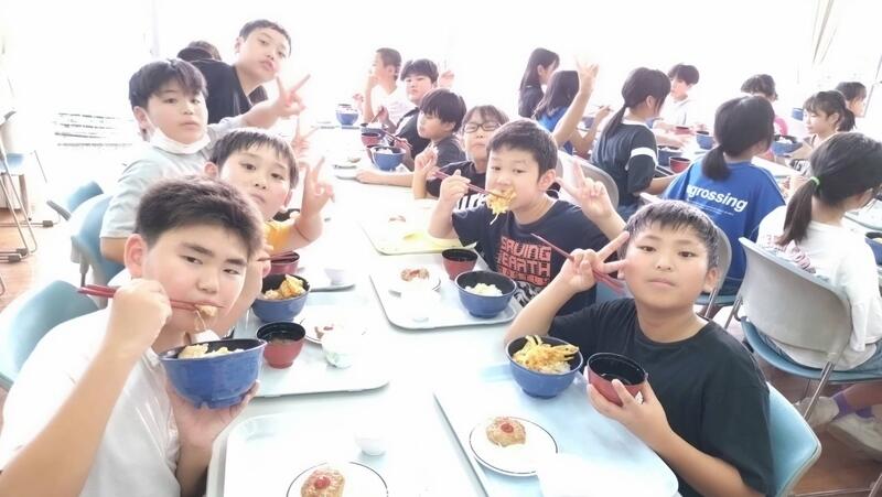 2日目のスタートは、朝のつどいです。旗揚げ係、活躍しました。ラジオ体操も頑張りました。学校紹介で他の学校と交流しました。