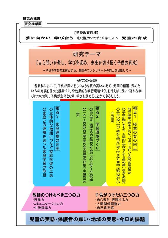 「質の高いめあての設定」や「発問の工夫」などを研究の視点とし、職員が一丸となって