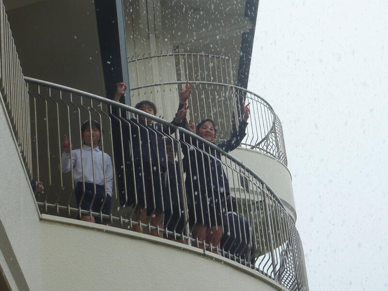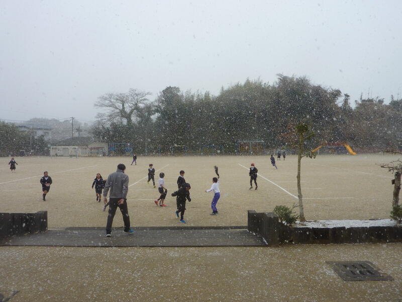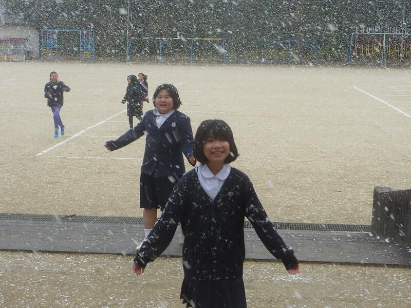 天気予報で予想していた降雪が朝からなく、のびっ子たちも少し残念がっていましたが、3時間目の終了と同時に大きな綿雪が降りてきました。チャイムと共に外に駆け出したのびっ子たちでした。なかには雪だるまをつくって見せに来てくれたのびっ子もいました。少しの間でしたが積雪もありそうです。雪化粧した学校は本年度初めてでした。