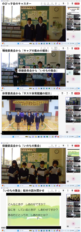 今月の児童集会はリモートで行いました。のびっ子会がキャスターを務め、3つ委員会からの連絡・報告がありました。保健委員会からは「いのちの集会」と題して「しあわせ」について呼びかけ、そして絵本の読み聞かせがありました。心温まる集会となりました。体育委員会の「サスケ(体育館編)」は動画が紹介されました。環境委員会からは、ペットボトルキャップ集めの集計発表がありました。心の体もポッカポッカののびっ子たちでした。