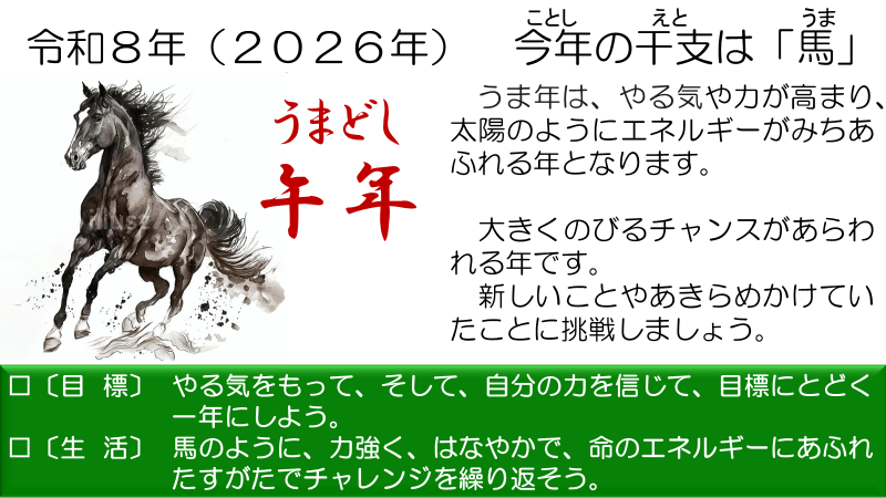 令和8年のスタートとともに3学期も始まりました。のびっ子たちの元気な声がこだまし、賑やかな学校が戻りました。今日は始業式でした。気温の低さもあり、ホールで行いました。中には半袖でがんばるのびっ子もおり、姿勢も態度も素晴らしい姿でした。短い学期です。今まで伸ばしてきた力も生かして、「すすんで、自分で、自分たちで」の学校生活が送れることを願います。