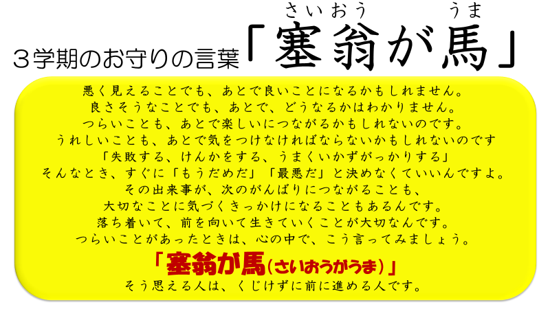 夏・秋・冬と三つの季節とともに過ごしてきた二学期が終わりました。長いようで、あっという間に感じられる学期でした。二学期は、学校行事をはじめ、さまざまな教育活動が詰まった学校生活となりました。のびっ子一人一人が「すすんで、自分で、自分たちで」のスローガンのもと、意欲的に学び、大きく成長した学期でもありました。また、「目標」「自分」「友達」「教師」へ主体的に関わる姿を大切にしながら教育活動を進めてきました。学校生活を通して、子どもたちは満足感や達成感を味わうとともに、新たな自分を発見することができたのではないかと感じています。今後も、のびっ子一人一人と丁寧に関わり、そのもつよさを認め、ほめ、励ますことを教育活動の基盤とし、子どもたちの可能性の実現に全力を注いでまいります。さて、明日から冬休みに入ります。「年の暮れ、年明け」という年またぎの体験を通して、新たな目標の実現に向けて、力強く生活していこうとする子どもたちの姿を期待しています。保護者・地域の皆様には、二学期、そして今年一年、多大なるご理解とご支援をいただき、心より感謝申し上げます。来年も、のびっ子、そして登立小学校をよろしくお願いいたします。どうぞ、よいお年をお迎えください。