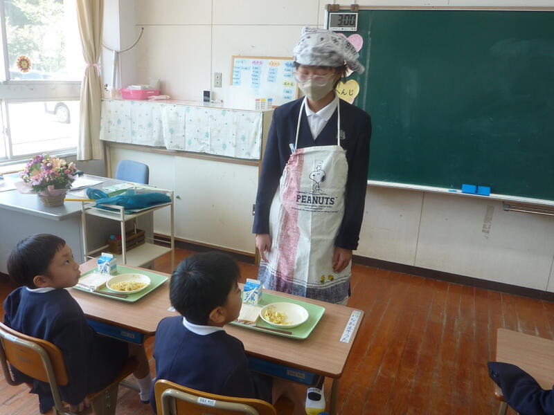 一年生にとっては、学校生活の全てが「初めて」です。「初めての給食」でした。6年生が駆けつけ、配膳のお手伝いをしてくれました。自分の席で静かに待っているしっかりも者の一年生のびっ子でした。