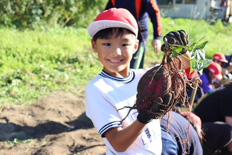 のびっ子(1,2年生)が育ててきたサツマイモが収穫の時を迎えました。お家の方々にご協力いただきながら、一つ一つ丁寧に収穫しました。大きなサツマイモ、長いサツマイモ、小さくてかわいいサツマイモと、たくさん収穫できました。