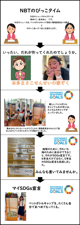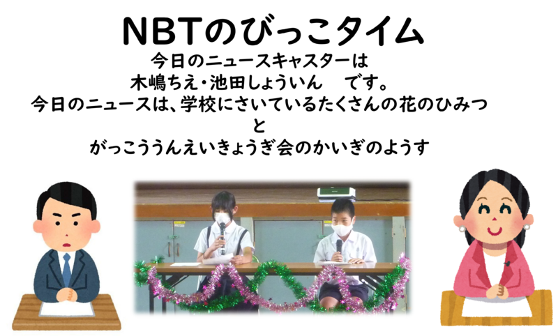今日は、のびっ子会の新企画が披露されました。「NBTのびっこタイム」です。この企画は児童集会を利用して校内の様子をニューススタイルで紹介するものです。のびっ子のアイディアに脱帽です。今回は環境をテーマにしたニュース報道でした。学校主事の平田先生への取材を通して、先生の一日を追いました。登立小の環境を美しくしてくださっていることへの感謝の念が、ぐっと深まった時間でした。次回が楽しみです。