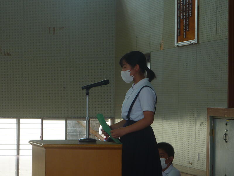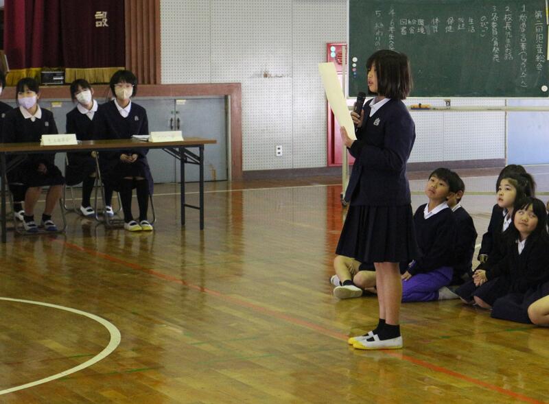 3校時の一コマを用いて集会活動「児童集会」を行いました。のびっ子委員会が中心となって、学校生活の反省とこれからの自分について考える機会としました。今回は、生活委員会と図書委員会からの連絡でした。持ち物の整理整頓、学校のもの、みんなが使うものの使い方について、全員で考えました。雨降りの日となりましたが、のびっ子の「すすんで」が確認できた一日となりました。