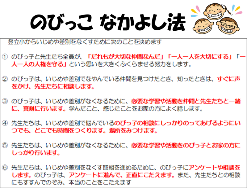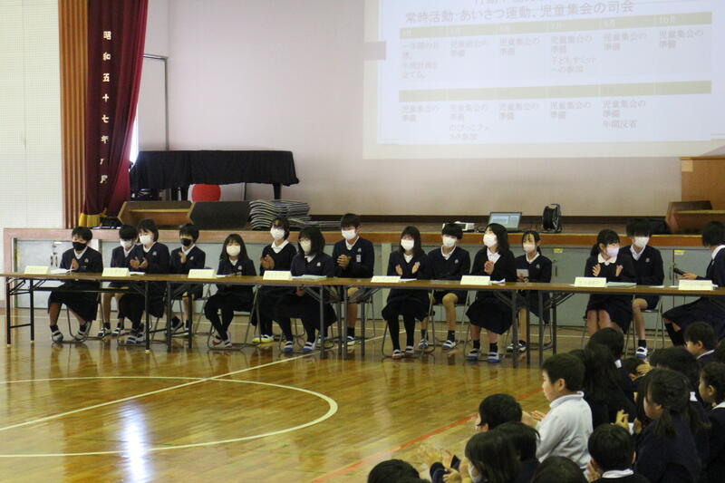 今日の5校時は児童集会でした。のびっ子会の企画運営で、よりよい学校生活について提案がありました。各委員会からは活動目標、年間計画の紹介があり、アイディアいっぱいの委員会活動が計画されていました。のびっ子会からは、SDGsに注目した「のびっ子SDGs大作戦」の予告があるなど、盛りだくさんの児童総会となりました。総会の最後には、先生たちからたくさんの感動を伝える言葉がのびっ子たちに伝えられました。「すすんで、自分で、自分たちで」の学校づくりが進んでいます。