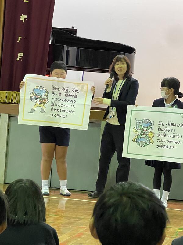 今日は、児童集会を開きました。「命の集会」と題して、保健委員会のみなさんが、絵本「ええところ」の読み聞かせをしてくれました。その後は教室に戻って、学級の友だちの「ええところ(よさ)」について伝え合ったのびっ子たちでした。また、集会では、おにぎり給食での「おにぎりグランプリ」の表彰もありました。