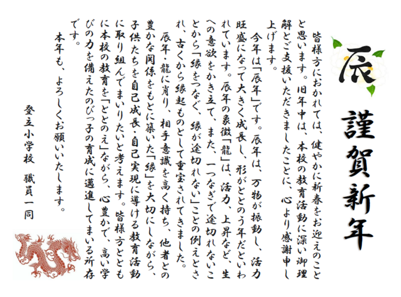 本日、二学期の終業式を行いました。式に臨むのびっ子たちの姿は全員凛々しく、とても立派に感じられました。夏から冬へと移り変わる季節とともに学校生活を過ごし、大きく成長できたと評価できるものでした。明日から冬休みに入ります。「年の暮れ、年明け」という年またぎの体験を通して、新たな目標を立て、その実現にむけて、力強く生活していこうとする決意の芽生えを期待したいと思います。皆様方には、ご支援いただき、心より感謝申し上げます。来年ものびっ子、登立小をよろしくお願い致します。