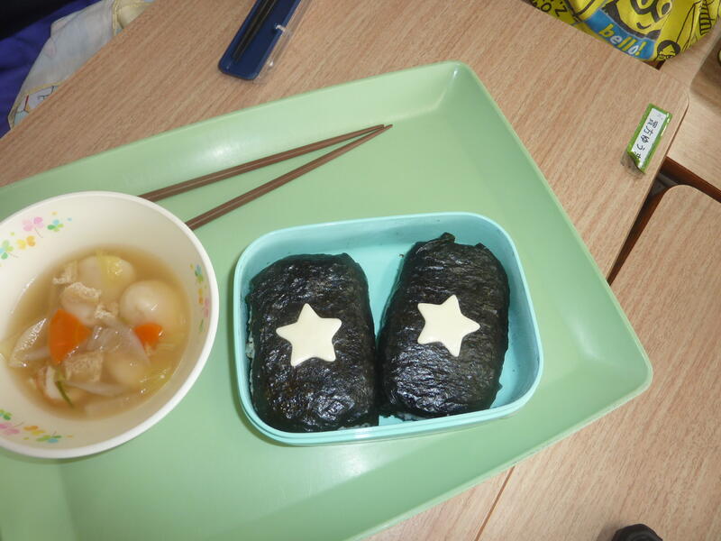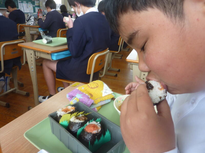 今日の給食は「おにぎり給食」でした。どの子も持参したおにぎりを大きな口を開けて、笑顔で食べていました。今日の給食では、おにぎりの中におかずが入っています。お米の味とともに各家庭の味をかみしめたのびっ子たちでした。おにぎりの花が咲く、楽しく、賑やかな時間となりました。