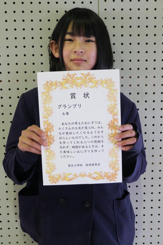 〔聞く姿勢もばっちりでした〕〔教室に戻って、友だちのよさを交流しました〕〔おにぎりグランプリの表彰 代表で賞状を受け取った6年生〕