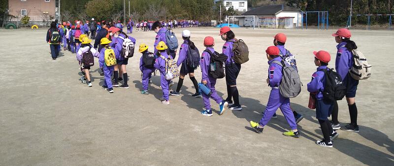 それぞれの学級が、一番近い出口から屋外への避難行動です。
