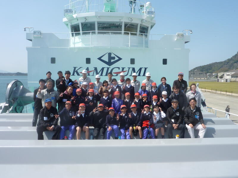 4年生が乗船体験活動に参加しました。今回の活動は、熊本県海運組合上天草市海運業次世代人材育成推進協議会様のご厚意により、実現したものです。天候にも恵まれました。進水したばかりの貨物船 第三舛宝山丸(舛宝海運)に乗船させていただきました。船内では、海運組合の方々のナビゲーションで船内の探索、そして航海を体験させていただきました。のびっ子たちは大興奮でした。船内はほとんどがオートメーション化されいて、驚きの連続でした。操舵室にも入れていただき、舵に触れることもできました。また船倉の広さにびっくりしました。サッカーもできるほどの空間がありました。今日の体験で海運業への理解と憧れをもったのびっ子たちでした。ご協力いただいた熊本県海運組合様、舛宝海運様に心より感謝申し上げます。
