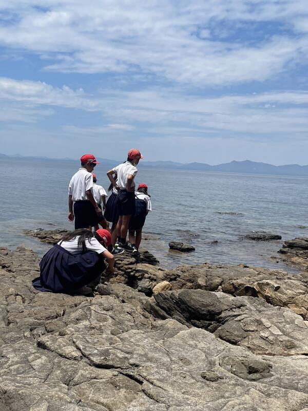 お弁当を食べて、学びの丘の探索です。海岸からは天草が見えました。