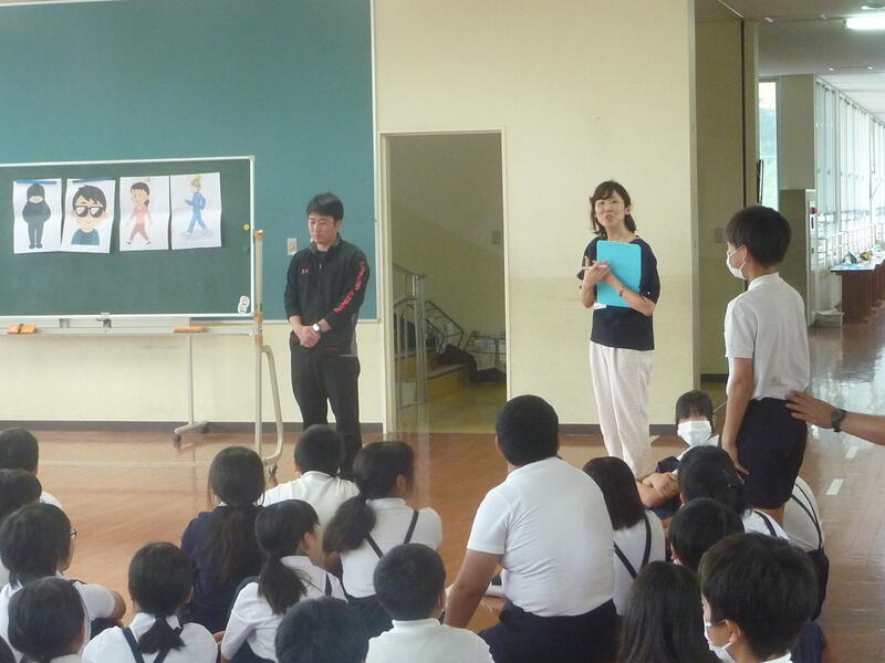不審者避難訓練を実施しました。朝から子供たち緊張気味でした。上天草警察署から来校いただき、迫力ある演技で不審者の姿を演じていただきました。職員で対応し、確保するといった行動、子供たちが安全に避難する行動を無事に行うことができました。起こってほしくない出来事ですが、危機を想定した取組として訓練があります。命を守る行動を学校全体で進めていきたいと思います。