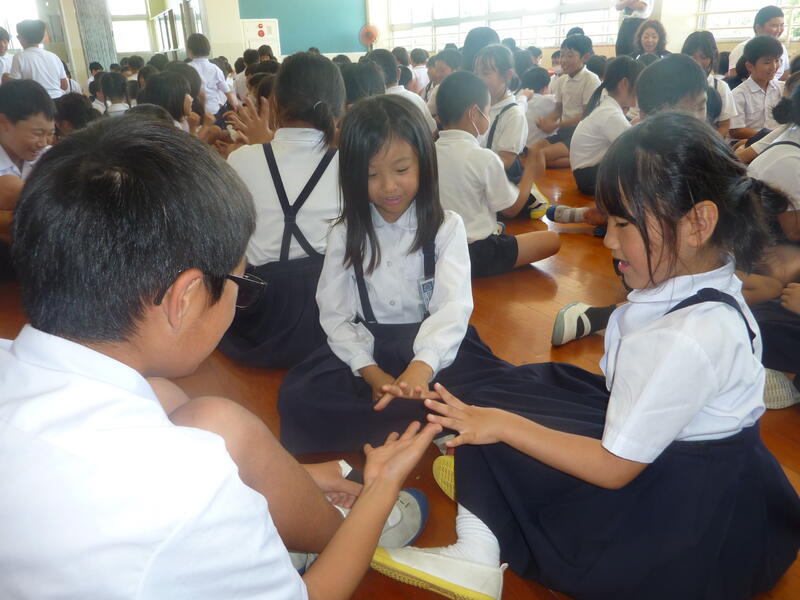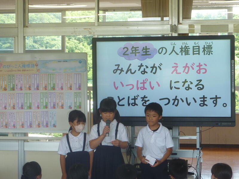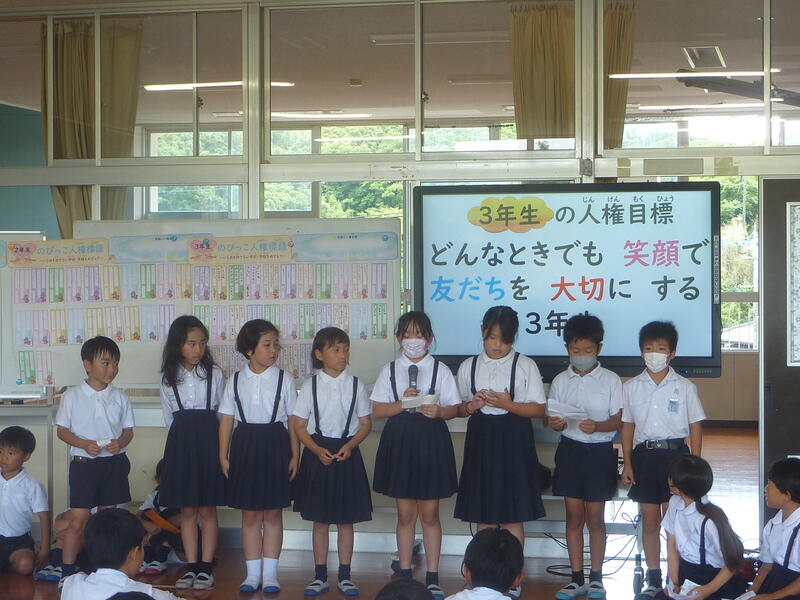 今日は暑い一日となりました。5時間目は人権集会を行いました。心のきずなを深める月間の取組としてのびっ子会の活動(児童会活動)として実施しました。三階ホールに全員が集まり、友だち、家族、先生、地域の方々との関わり方、関係を大切にできる自分探しの活動を行いました。