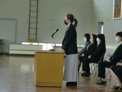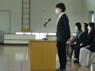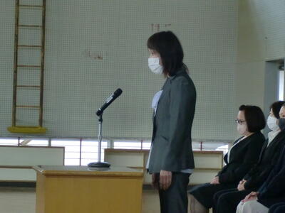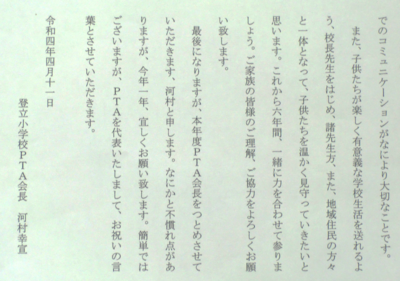 本年度は、新型コロナウイルスの対策を強化したため、1年生、保護者、教職員、市教委のみでの式となりました。PTA会長の河村様には、ご祝辞を用意していただきました。この場を借りてご紹介します。