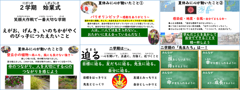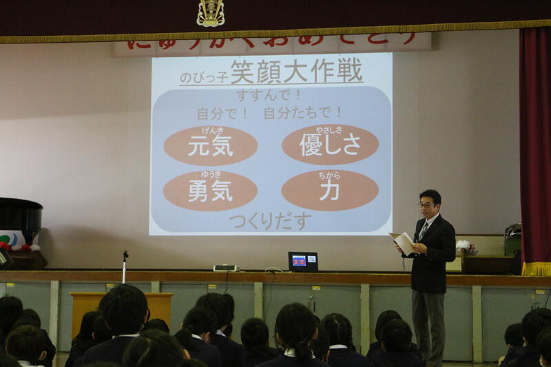 本日、令和6年度を始業しました。のびっ子の学校生活もスタートです。「笑顔、元気、命輝くのびっ子」のより一層の成長をめざして、全員で手を携えて進みます。 〔就任式~6人の先生方をお迎えしました~〕〔始業式~のびっ子笑顔大作戦~〕