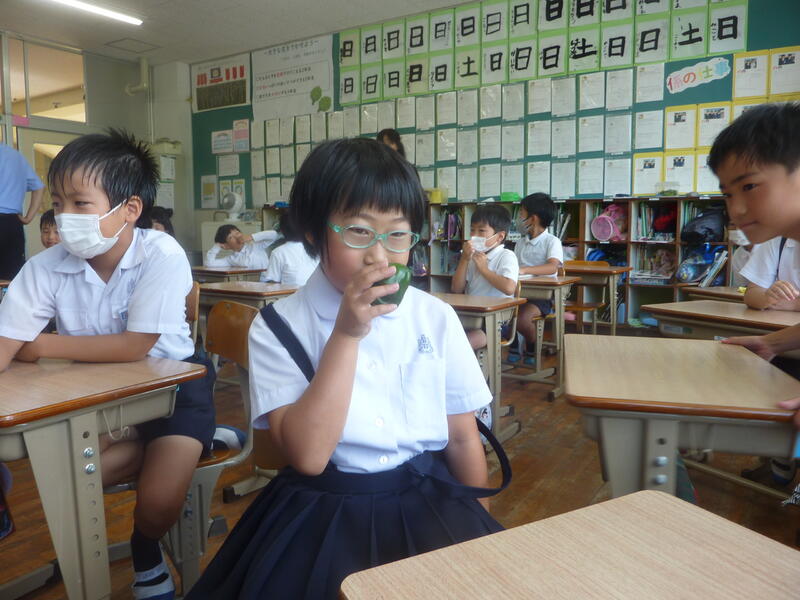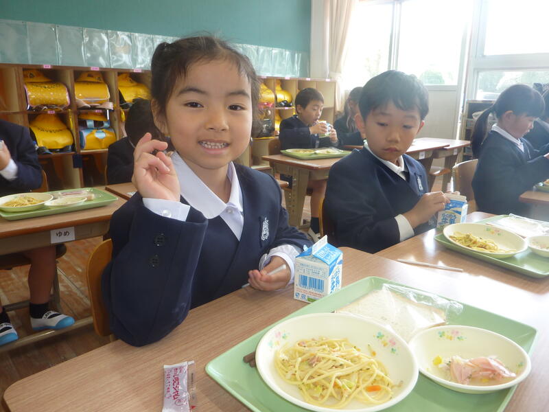 一年生にとっては、学校生活の全てが「初めて」です。「初めての給食」でした。6年生が駆けつけ、配膳のお手伝いをしてくれました。自分の席で静かに待っているしっかりも者の一年生のびっ子でした。