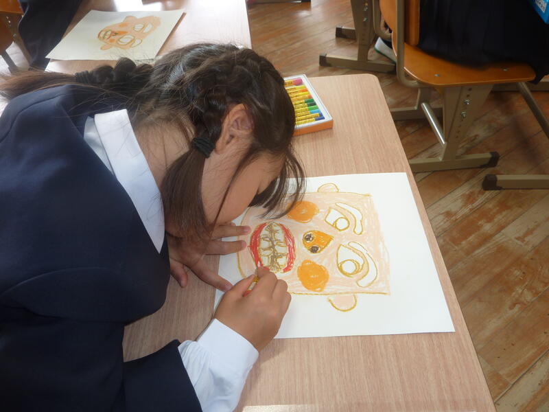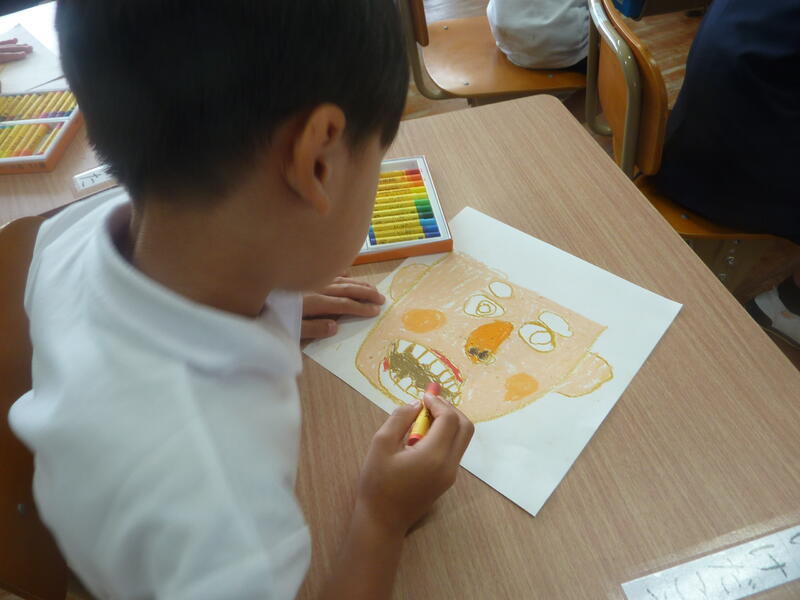 入学から10日目を迎えた一年生がクレヨンを使って自分の顔を描く学習活動を行っています。担任の先生と一緒に、クレヨンの使い方を学びながら、色の濃淡に気を付けながら描いていました。どの子も笑顔の自分を、とても上手に描いていました。