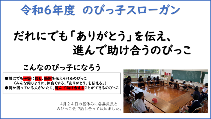 のびっ子会の今年のスローガンが決まりました。今日は代表の6年生が説明に訪れました。やる気満々、アイディアいっぱいの様子に、楽しい児童会活動への期待が膨らみました。
