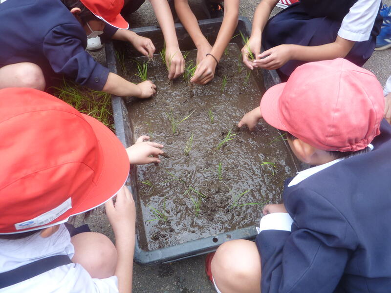 五年生の社会科学習の一コマです。水稲の苗植え体験を行いました。水田での米作り活動をしていない本校では、今は取り組めない貴重な体験です。品種「ぴかまる」の苗を教室で生育させて、今日の活動を行いました。小規模で疑似的ではありますが、主食である米の生産活動に触れる深い学びとなりました。収穫目指して精一杯のお世話と観察を続けてほしいと願います。