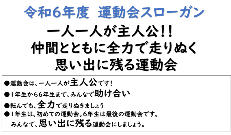 晴天の下、運動会を開催することができました。166人ののびっ子が全力で体育学習の成果を発表しました。応援においでになった方々のご声援で、全員いつも以上の力を発揮していたように感じました。笑顔・元気・命かがやく運動会になりました。