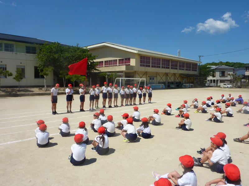 今日から運動会に向けての全体練習を始めました。赤団、白団に分かれて、運動場に整列したのびっ子たち。快晴の下、団長さんの掛け声できちんと整列できました。今日は、結団式、入場行進に取り組みました。