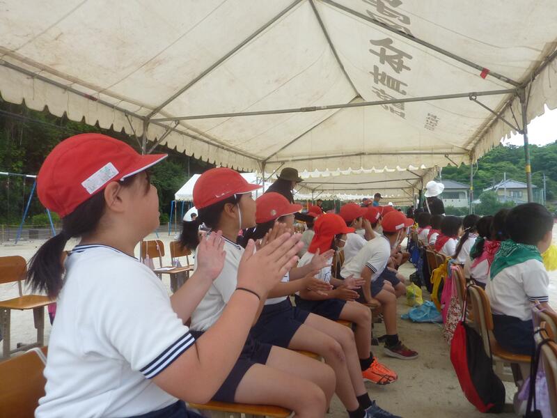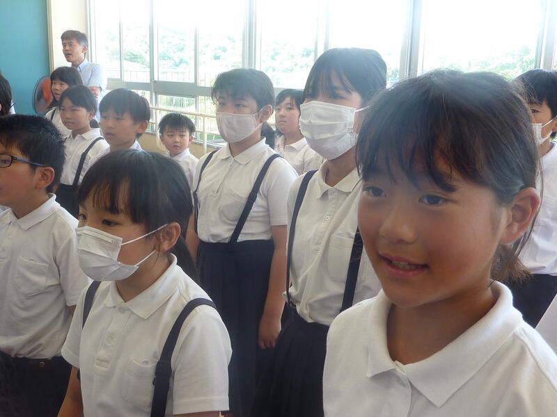 〔気温も高く、扇風機フル回転でしたが、元気いっぱいの のびっ子たちです〕〔学年代表の発表です。堂々と、そして、思いのこもった内容でした〕