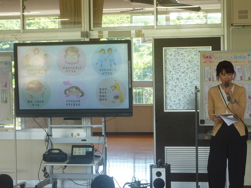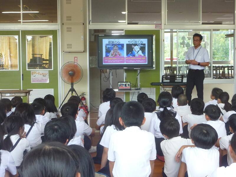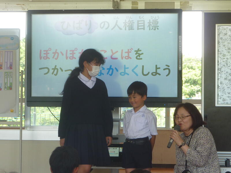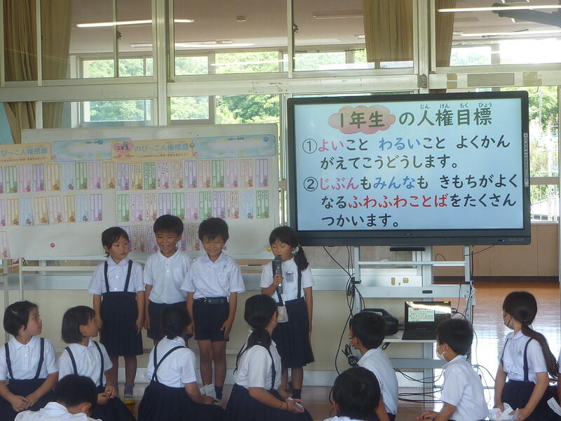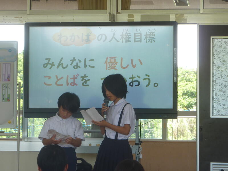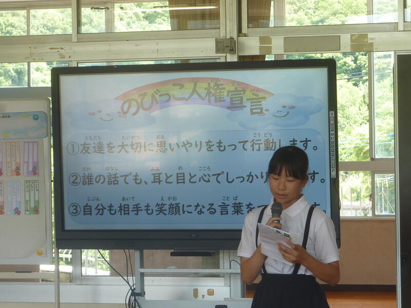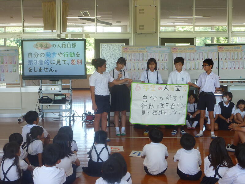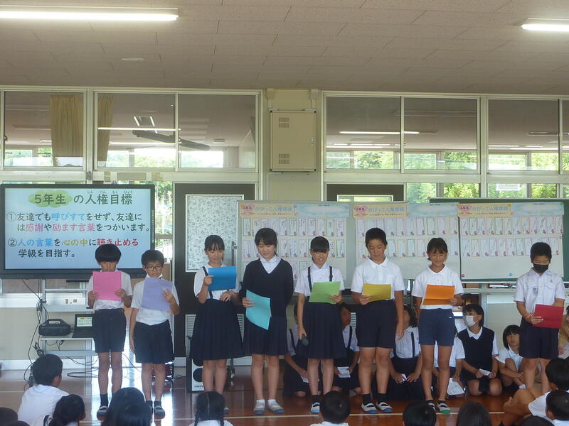 今日は暑い一日となりました。5時間目は人権集会を行いました。心のきずなを深める月間の取組としてのびっ子会の活動(児童会活動)として実施しました。三階ホールに全員が集まり、友だち、家族、先生、地域の方々との関わり方、関係を大切にできる自分探しの活動を行いました。