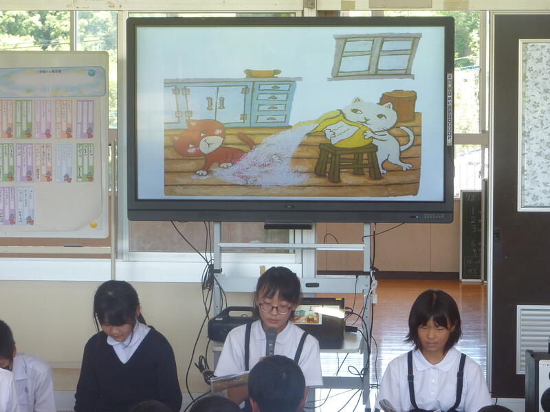 今朝は、地域ボランティアの方々が来校され、読み聞かせ活動を実施していただきました。図書委員会の子供たちたちが中心となって場づくりを行いました。読み聞かせが始まると、絵本の世界に引き込まれていったのびっ子たちでした。