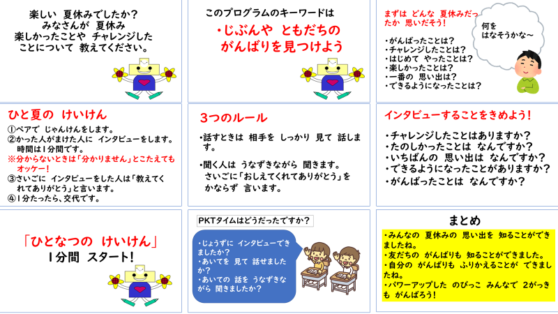 今朝は、PKTを行いました。1学期は、のびっ子全員で行っていた活動ですが、2学期からクラスでの活動にも取り組みます。今日のテーマは「ひと夏の経験」でした。友だちと自分の思いでを語りながら、聞きながら「相手に迫る」「自分に迫る」のびっ子たちでした。活動を通して「心地よさ」を感じた時間だったようです。来週のPKTは全体活動です。