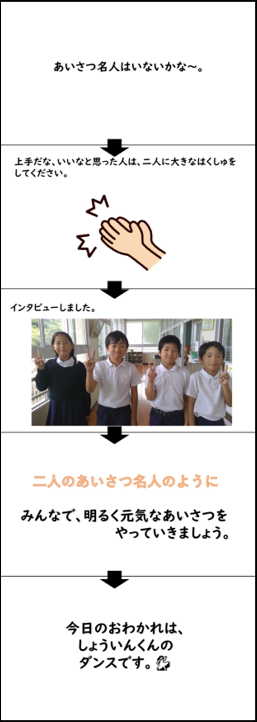 今朝の集会は、教頭先生の講話でした。「人とつながる」ことを話題に全員でSST(ソーシャル・スキル・トレーニング)に取り組みました。友だちとのつながり方、地域の方とのつながり方など、言葉だけでなく、行動で伝えるコミュニケーションの方法も学びました。いつものびっ子の安全を守ってくださっている地域の方々へのつながり方では「あいさつの後の一言って大切だなぁ。」って感じることもできたようでした。