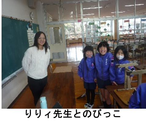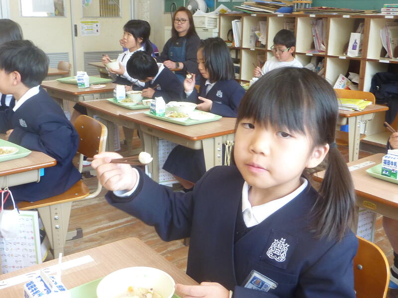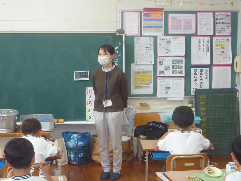 今日は、給食の時間に、ご指導をいただきました。大矢野中学校の池田先生にご来校いただき、食に関する指導をしていただきました。献立の揚げパンで口をいっぱいにしながら、笑顔で池田先生のお話を聞いていたのびっ子たちでした。