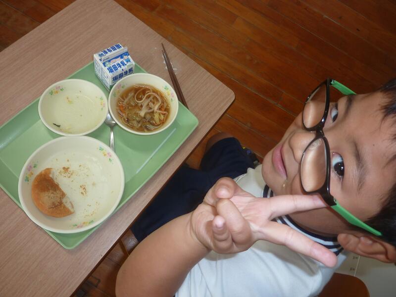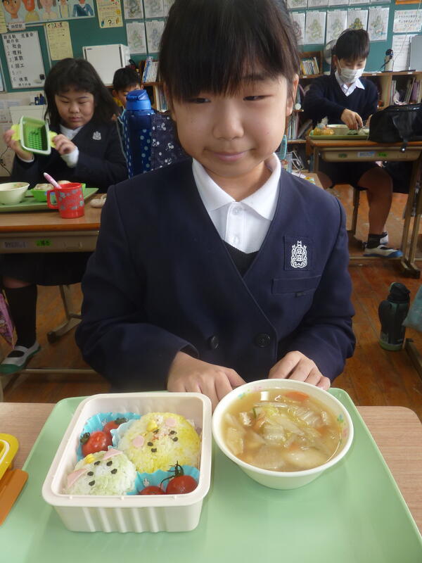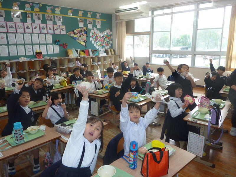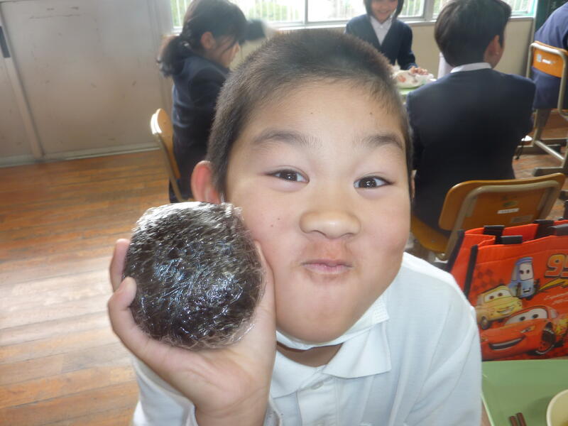 今日の給食は「おにぎり給食」でした。どの子も持参したおにぎりを大きな口を開けて、笑顔で食べていました。今日の給食では、おにぎりの中におかずが入っています。お米の味とともに各家庭の味をかみしめたのびっ子たちでした。おにぎりの花が咲く、楽しく、賑やかな時間となりました。