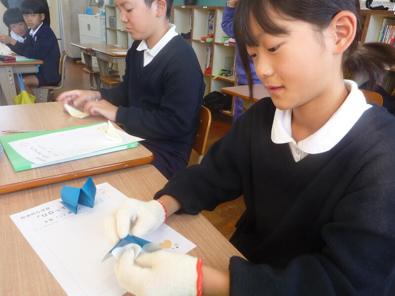 〔手袋をつけて折り紙を折ってみました。「難しい!」〕
