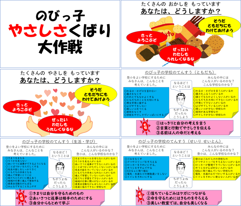 今日は、児童集会を開きました。のびっ子会が中心となっての月に一度の活動です。今回は環境委員会からペットボトルキャップ収集活動の成果について紹介がありました。その後はNBT(のびっこタイム)で、能登半島地震に係るのびっ子の行動について話し合い活動をしました。「優しさを配る」ことを視点に全員で、自分たちにできる「やさしさ」について考えました。心を使いながら、しっかりと考えを深めた時間となりました。