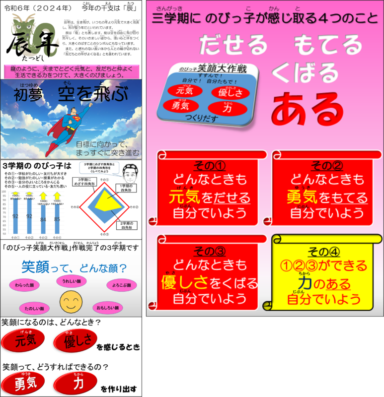 本日、三学期をスタートしました。今朝は気温が低く、底冷えする体育館での始業式でしたが、のびっ子の元気に姿に、次第に身も心もポカポカと暖かさ感じました。新しい年とともに、三学期の学校生活への期待を抱かせる時間となりました。