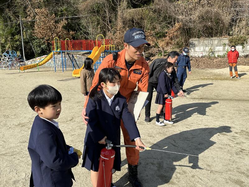 〔避難を終え、消防署の方からお話を聴くのびっ子〕〔消火器も上手に使えました〕