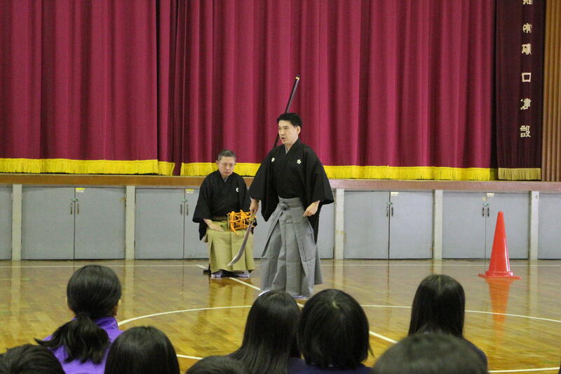 おにぎり給食の後は、能楽鑑賞会を開きました。武田太加志記念能楽振興財団のご厚意により、能楽師の武田友志さん(重要無形文化財保持者)においでいただき、能楽の上演と講義を行っていただきました。本物に触れる機会を得たのびっ子たちは、とても貴重な時間を過ごすことができました。お力添えいただいた皆様方に心より感謝申し上げます。700年の歴史の重みとともに、能を身近に感じることができました。学びなおしで、日本の伝統文化、伝統芸術への興味関心と伝承への意識を高めていきたいと思います。