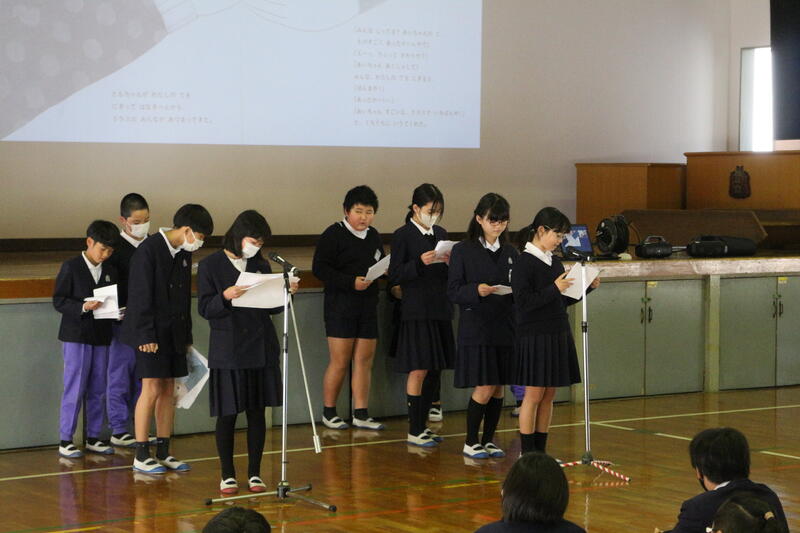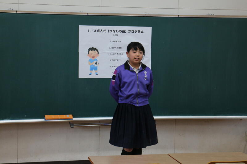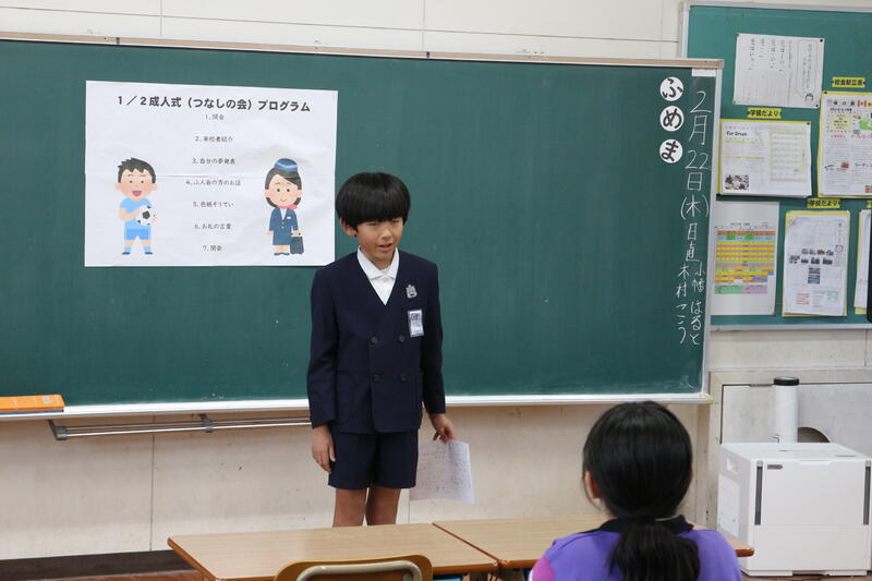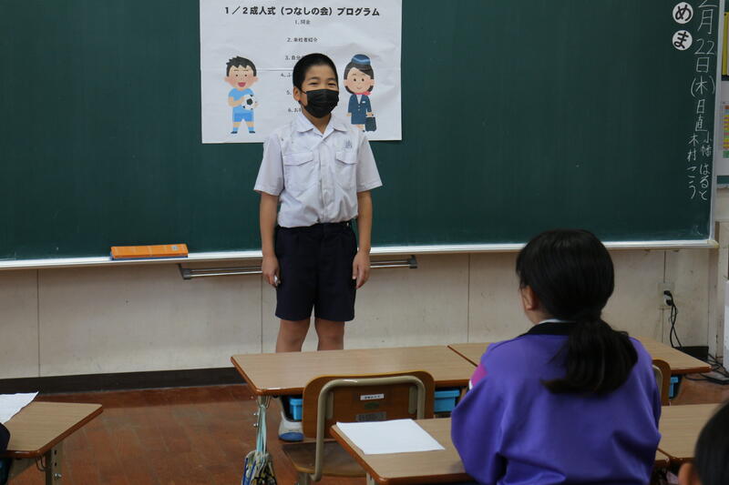 4年生の二分の一成人式「つなしの会」を開き十歳のお祝いをしました。全員が将来の夢について語り、十歳の誓いを述べました。更生保護女性会の方々もご来校くださり、手作りのお祝いの色紙を子供たち一人一人にいただきました。「つなしの会」を通して、成長の意味とともに地域の方々に見守られている喜びを感じたのびっ子たちでした。