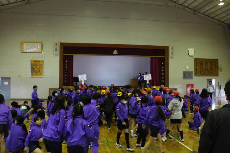 〇体育館での交流活動の様子です。学校生活の〇×クイズ、グループづくり活動。6年生との交流も深まりました。〇運動場ではドッチボール、鬼ごっこを楽しみました。