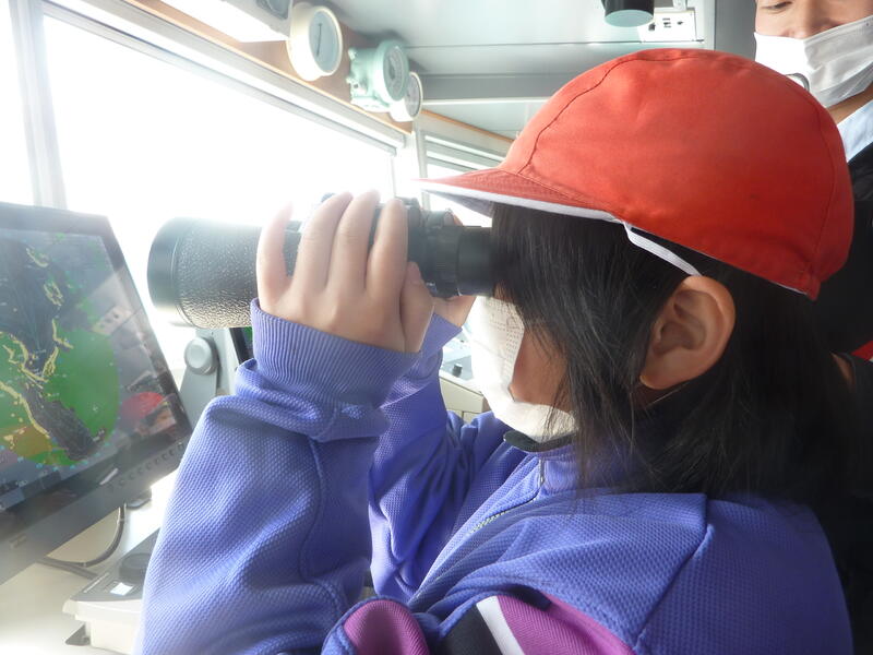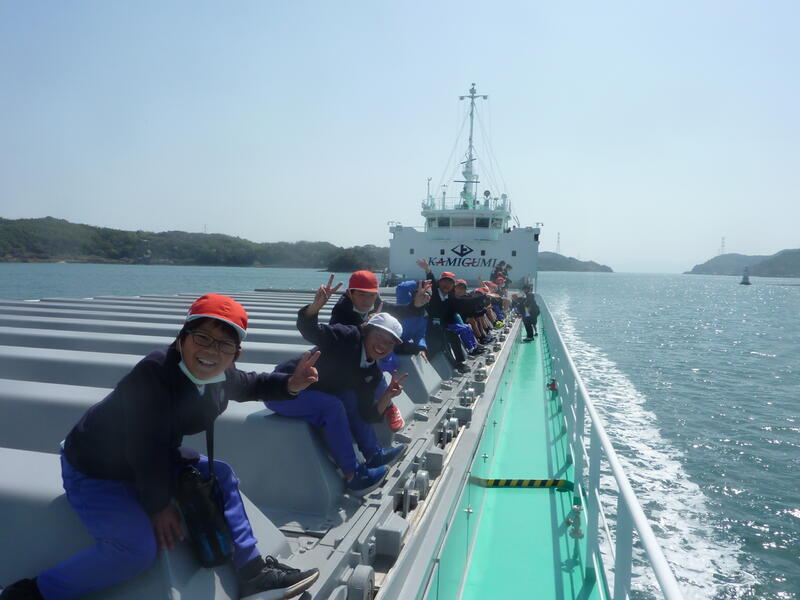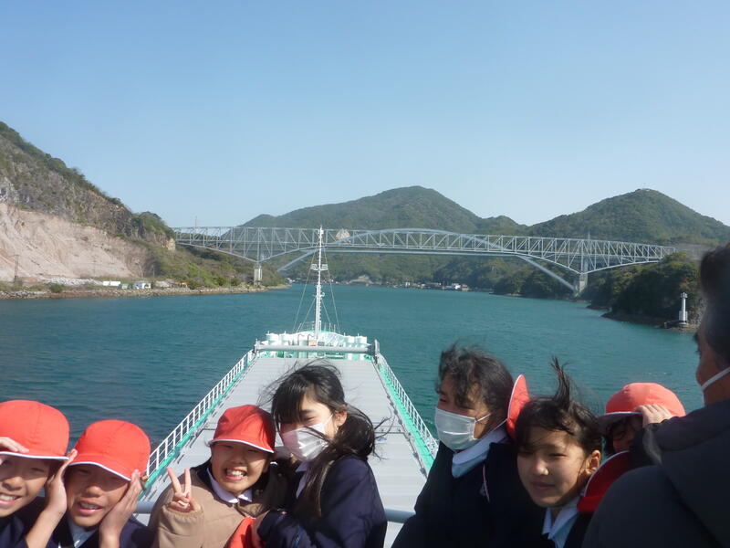 4年生が乗船体験活動に参加しました。今回の活動は、熊本県海運組合上天草市海運業次世代人材育成推進協議会様のご厚意により、実現したものです。天候にも恵まれました。進水したばかりの貨物船 第三舛宝山丸(舛宝海運)に乗船させていただきました。船内では、海運組合の方々のナビゲーションで船内の探索、そして航海を体験させていただきました。のびっ子たちは大興奮でした。船内はほとんどがオートメーション化されいて、驚きの連続でした。操舵室にも入れていただき、舵に触れることもできました。また船倉の広さにびっくりしました。サッカーもできるほどの空間がありました。今日の体験で海運業への理解と憧れをもったのびっ子たちでした。ご協力いただいた熊本県海運組合様、舛宝海運様に心より感謝申し上げます。